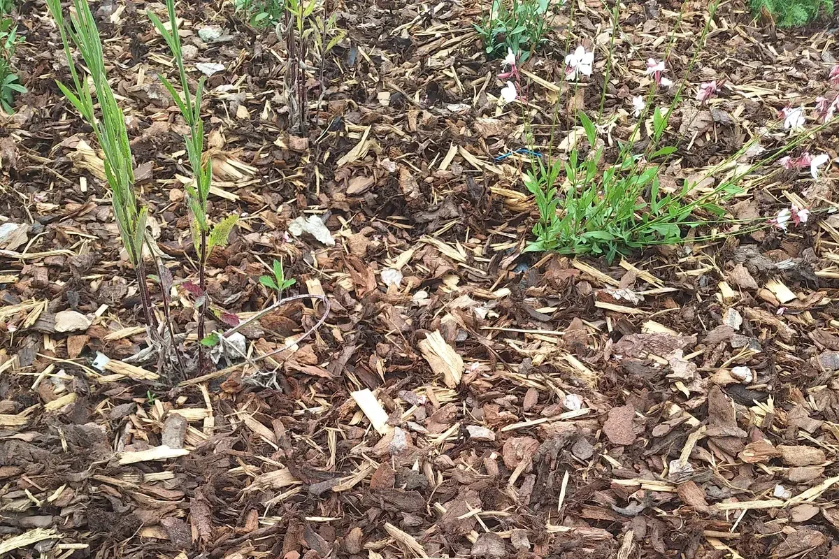 Een laag boomschors helpt om de bodem te beschermen en vermindert de kans op onkruid in het bloembed